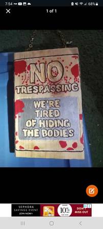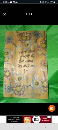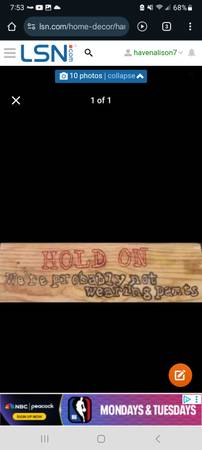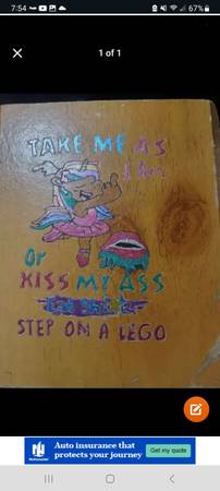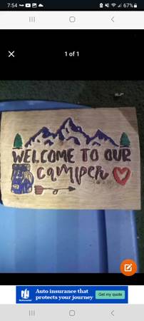 All signs are hand crafted. Some are etched, burnt, colored, and/or engraved. I also take requests and have loads more than just these ones but am restricted on the amount of pictures. They vary in size from 3" x 5" to 16" x 24". $5.00- Probably not wearing pants. $10.00- Can't hammer common sense. $15.00-Step on a lego & Welcome to our camper. $20.00-No Tresspassing & It's not what you look at. $25.00-Bigfoot inside his foot. $30.00- As I sit in Heaven & Anchors & The retirement crying towel. Messaging on here or text is best. Help me share my art.