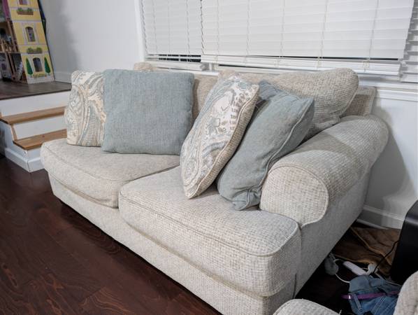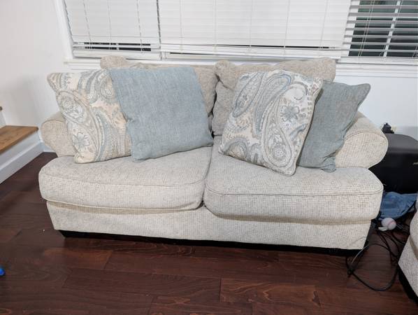 Love seat originally bought from Ashley Furniture. Sits two comfortably. Easy to clean; upholstery cleaner or cushion covers can come off and thrown in the laundry. Comes with four pillows. Venmo or...
