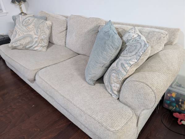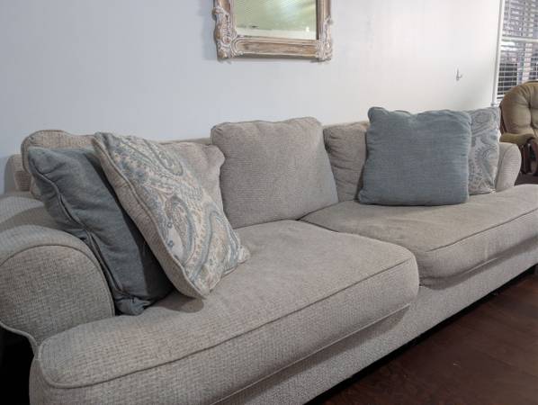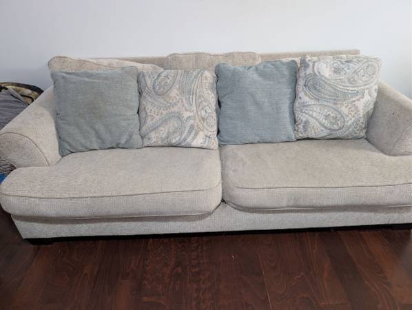 Couch originally bought from Ashley Furniture. Cushion coverings and pillow cases can be removed and cleaned in the washing machine. For other small spots, upholstery cleaner will do fine. Can seat...