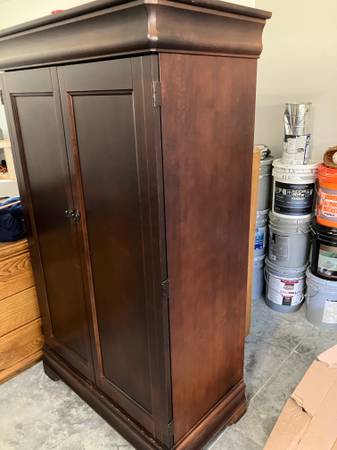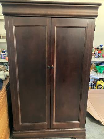This is a solid wood armoire and is very well constructed. It has a place for a TV and has two drawers. There is an extra shelf if you choose not to have a TV. 43"W X 23"D X 71"H $195.00 CASH