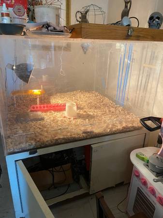 4’x4’ acrylic cage/tank with doors on each side. I used it for large lizards, puppies, and baby chicks. It has a metal stand with lots of storage underneath.