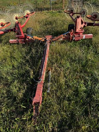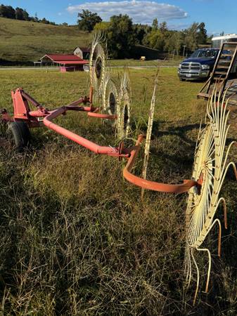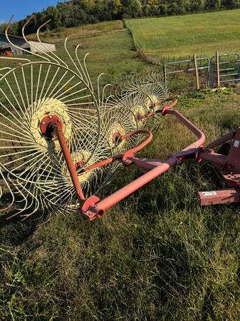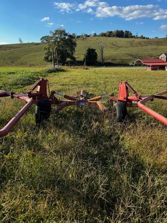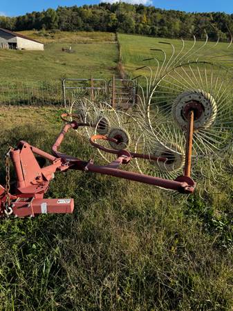 Used 10 wheel hydraulic V- pull style hay rake in good condition, no bent tine wheels, everything works as it should, also have a IH round Baler - and a IH roller bar hay rake for sale!