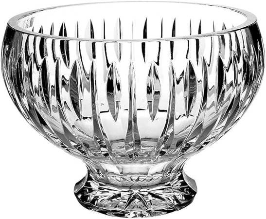The Marquis by Waterford Caprice Footed Centerpiece Bowl 10” in diameter, is a crystal serving bowl characterized by its bold and dynamic design featuring sparkling wedge and leaf cuts that highlight the brilliant clarity of fine crystal. It is made from lead-free crystalline material, providing substantial weight and stability. The bowl stands 10 inches in height.